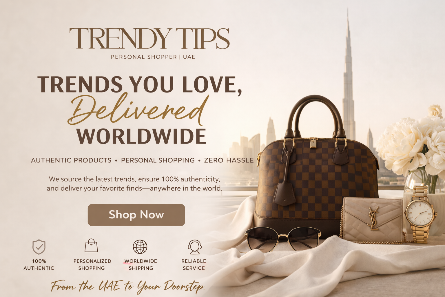 Featured Products Add to compare Quick view Add to wishlist Trendy Product 1 $230.00 Add to cart Add to compare Quick view Add to wishlist Trendy Product 2 $230.00 Add to cart Add to compare Quick view Add to wishlist Trendy Product 3 $230.00 Add to cart Add to compare Quick view Add to wishlist Trendy Product 4 $230.00 Add to cart Brands Curated Trends. Delivered Globally. Experience effortless shopping with handpicked, authentic pieces from the UAE. Shop Now